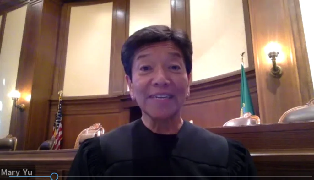 Fred Rabb—the only known lawyer to be sworn in from his bedroom.Supreme Court Justice Mary Yu swearing Fred in from the Temple of Justice in Olympia.