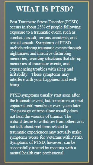 The Seattle area has many resources available to people suffering from psychological injury, including PTSD and other anxiety disorders related to trauma. The VA publishes information regularly about PTSD. The University of Washington conducts short term exposure treatment (STEP) research, and the UW Center for Anxiety and Traumatic Stress offers treatment.