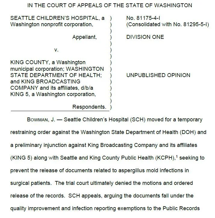 Despite admitting long-term Aspergillus contamination in the hospital, Seattle Children’s intervened, claiming that its communications with a public agency that reports to the public were not, in fact, public. Seattle Children’s tried to prevent the public from learning more about the safety of the hospital by alleging that its coordination with state officials was part of its internal “quality improvement” committee. The trial judge disagreed, and Seattle Children’s appealed.