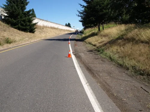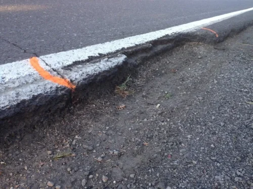 Safety standards in the transportation engineering field recommend that pavement edge drop-offs be kept to a depth of no greater than two inches. The Washington Department of Transportation (WSDOT) striping truck had came upon the pavement edge pothole and had painted the white fog stripe around it. In other words, WSDOT clearly acknowledging the hazard but did not report or repair it.