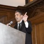 A smiling man in a blue suit sits at a table in an ornate, wood-paneled room.